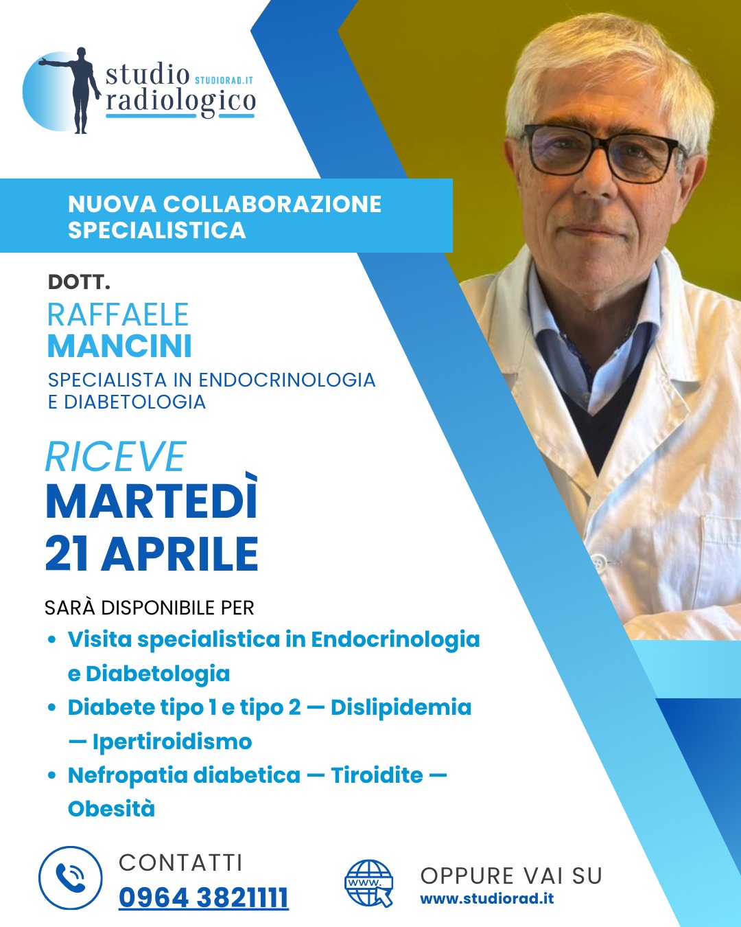 Martedì 21 Aprile riceve il Dott. Raffaele Mancini, Specialista in Endocrinologia e Diabetologia, con 43 anni di esperienza nel campo delle patologie metaboliche ed endocrine.